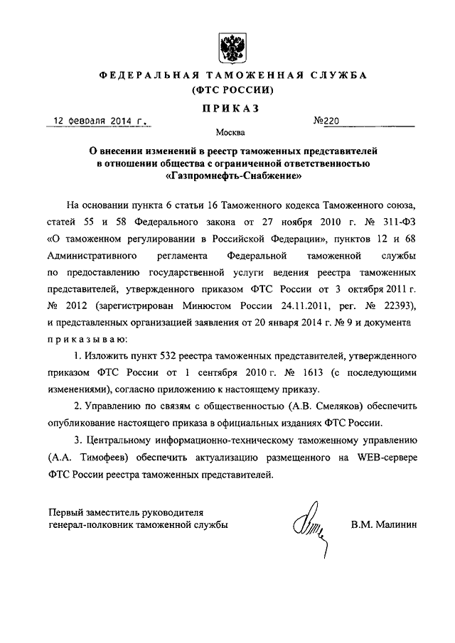 ПРИКАЗ ФТС РФ от 12.02.2014 N 220