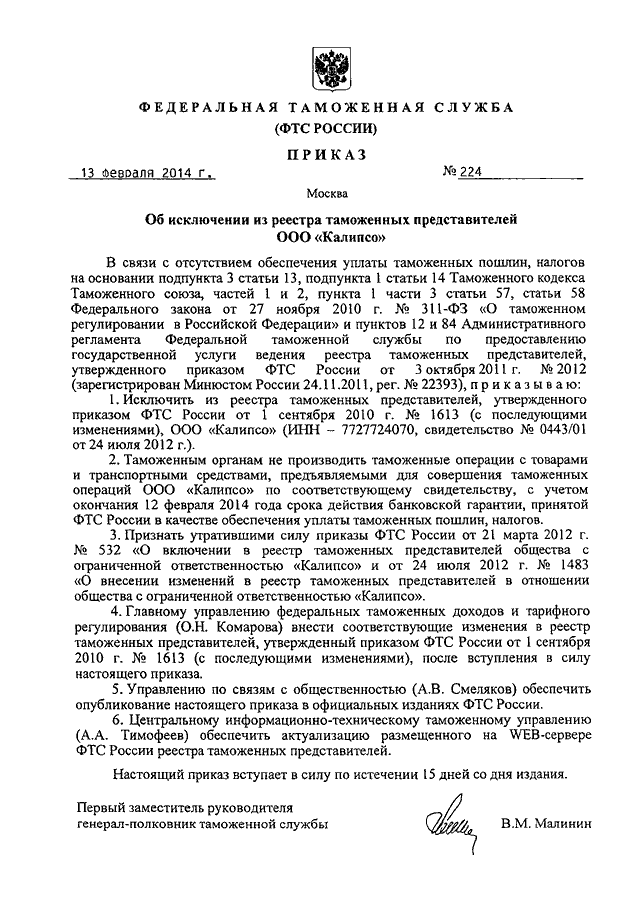 ПРИКАЗ ФТС РФ от 13.02.2014 N 224
