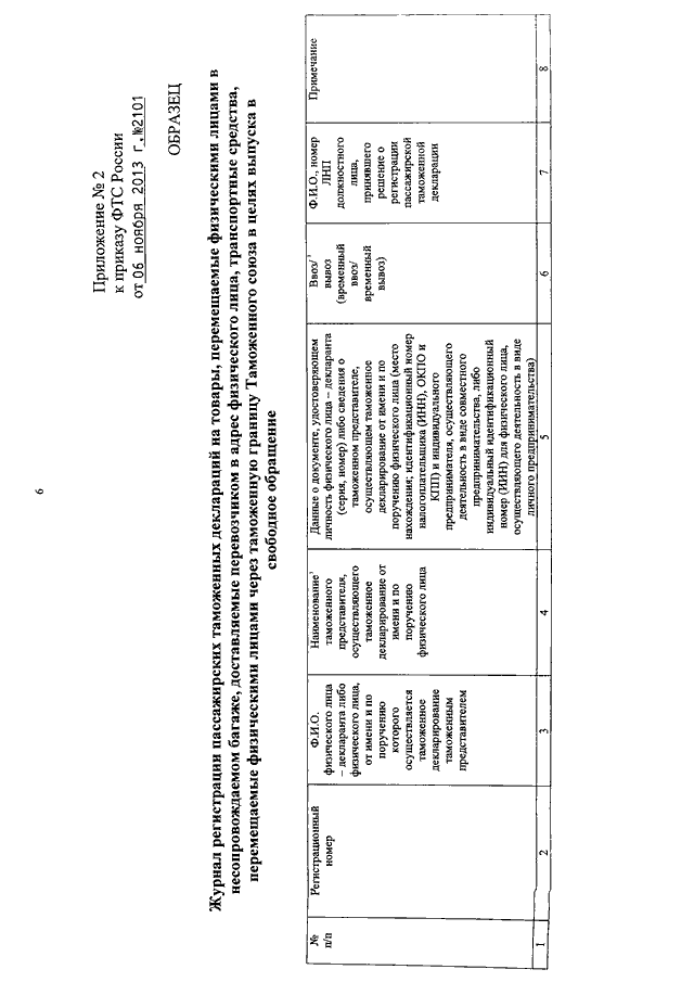 "ОБ УТВЕРЖДЕНИИ ПОРЯДКА РЕГИСТРАЦИИ ПАССАЖИРСКИХ ТАМОЖЕННЫХ ДЕКЛАРАЦИЙ И ОБРАЗЦА ЖУРНАЛА РЕГИСТРАЦИИ ПАССАЖИРСКИХ ТАМОЖЕННЫХ ДЕКЛАРАЦИЙ НА ТОВАРЫ, ПЕРЕМЕЩАЕМЫЕ ФИЗИЧЕСКИМИ ЛИЦАМИ В НЕСОПРОВОЖДАЕМОМ БАГАЖЕ, ДОСТАВЛЯЕМЫЕ ПЕРЕВОЗЧИКОМ В АДРЕС ФИЗИЧЕСКОГО ЛИЦА, ТРАНСПОРТНЫЕ СРЕДСТВА, ПЕРЕМЕЩАЕМЫЕ ФИЗИЧЕСКИМИ ЛИЦАМИ ЧЕРЕЗ ТАМОЖЕННУЮ ГРАНИЦУ ТАМОЖЕННОГО СОЮЗА В ЦЕЛЯХ ВЫПУСКА В СВОБОДНОЕ ОБРАЩЕНИЕ"