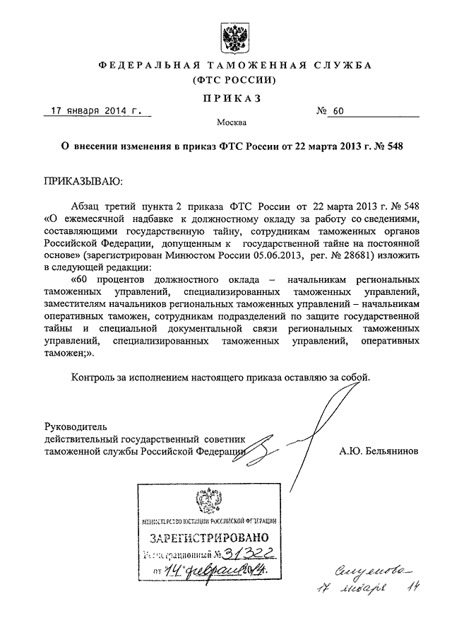 ПРИКАЗ ФТС РФ от 17.01.2014 N 60