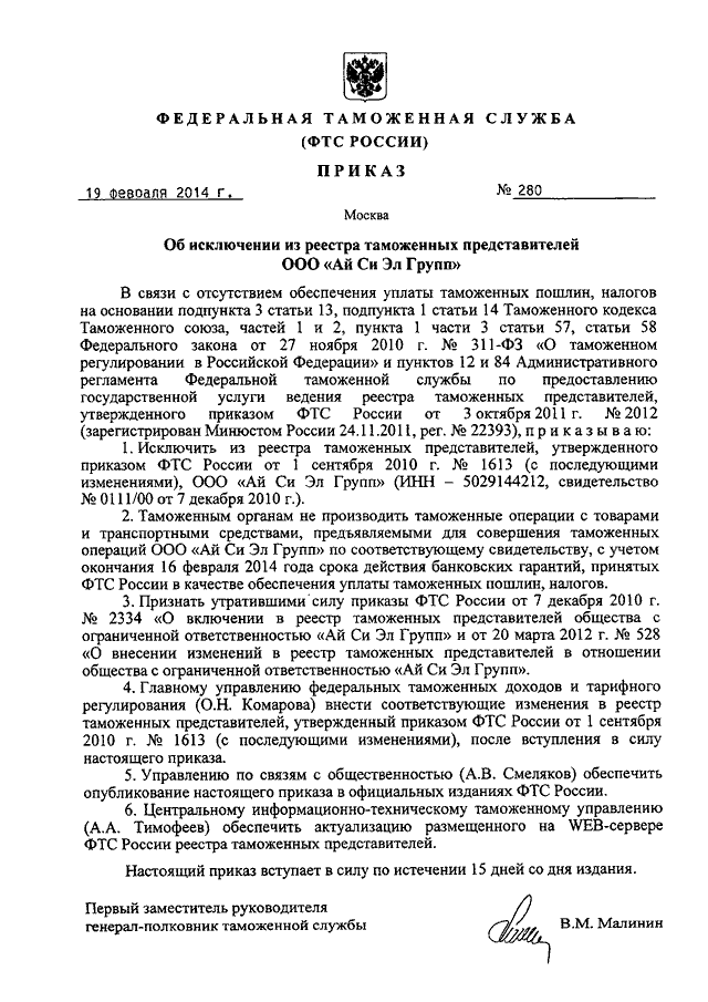 ПРИКАЗ ФТС РФ от 19.02.2014 N 280