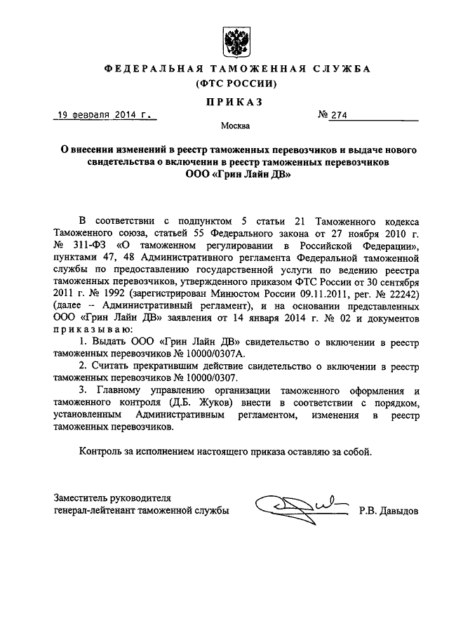 "О ВНЕСЕНИИ ИЗМЕНЕНИЙ В РЕЕСТР ТАМОЖЕННЫХ ПЕРЕВОЗЧИКОВ И ВЫДАЧЕ НОВОГО СВИДЕТЕЛЬСТВА О ВКЛЮЧЕНИИ В РЕЕСТР ТАМОЖЕННЫХ ПЕРЕВОЗЧИКОВ ООО "ГРИН ЛАЙН ДВ"