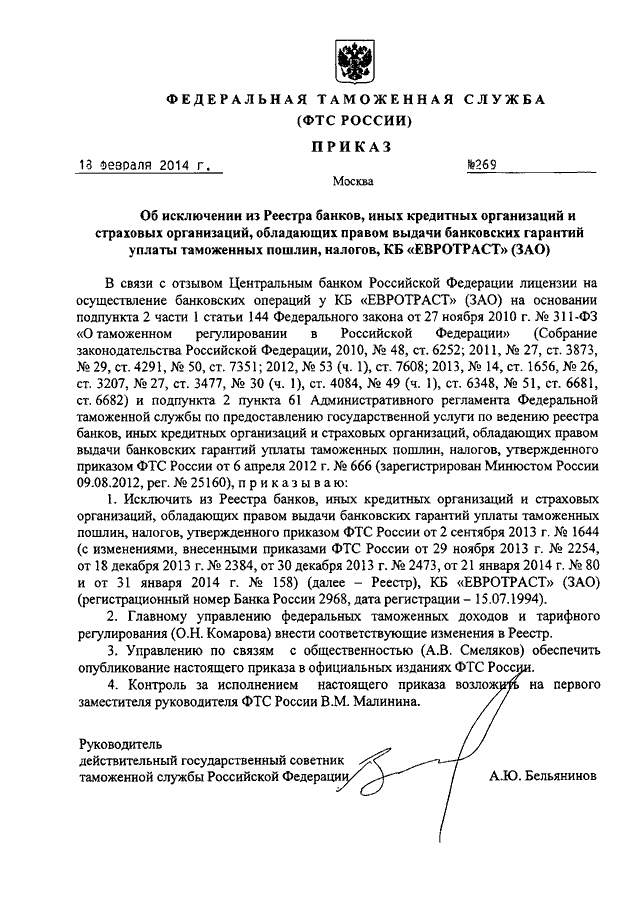 ПРИКАЗ ФТС РФ от 18.02.2014 N 269