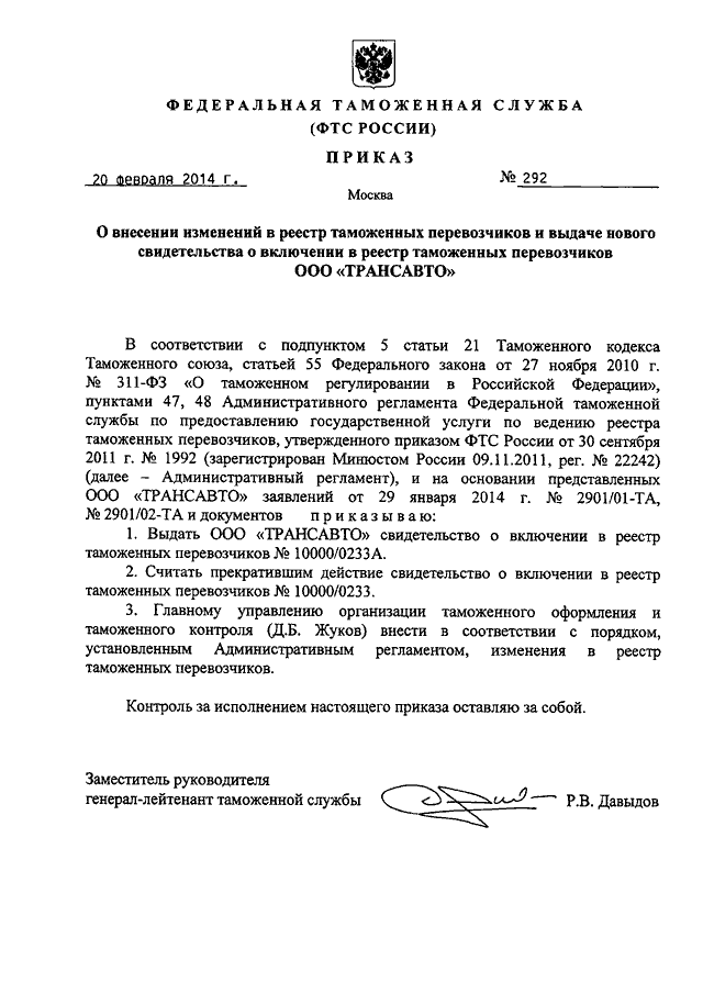 ПРИКАЗ ФТС РФ от 20.02.2014 N 292