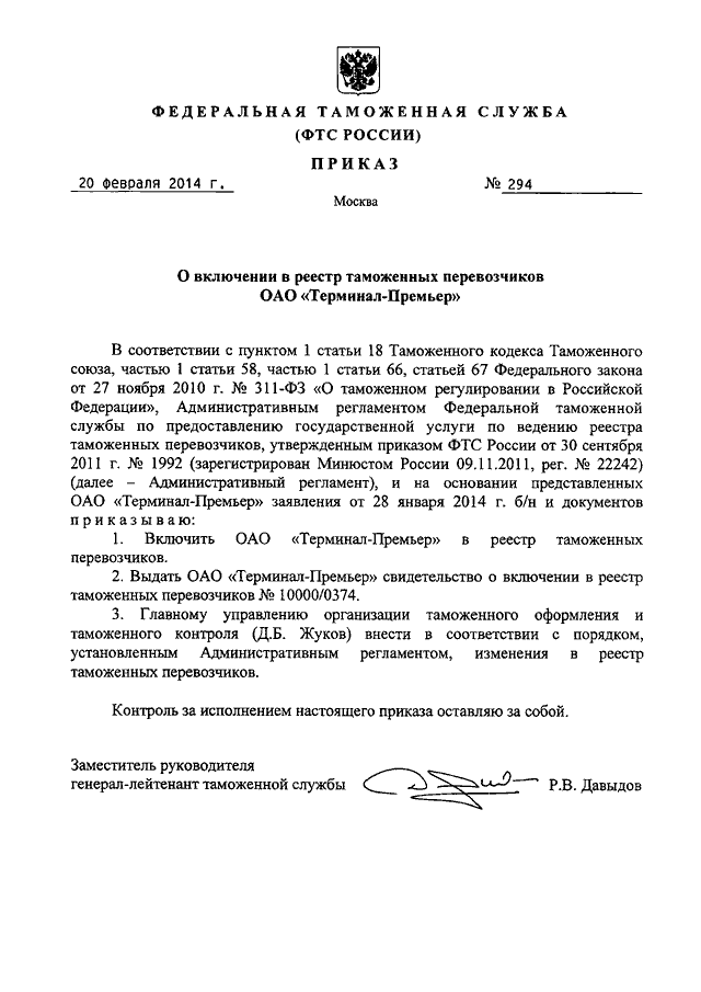 ПРИКАЗ ФТС РФ от 20.02.2014 N 294
