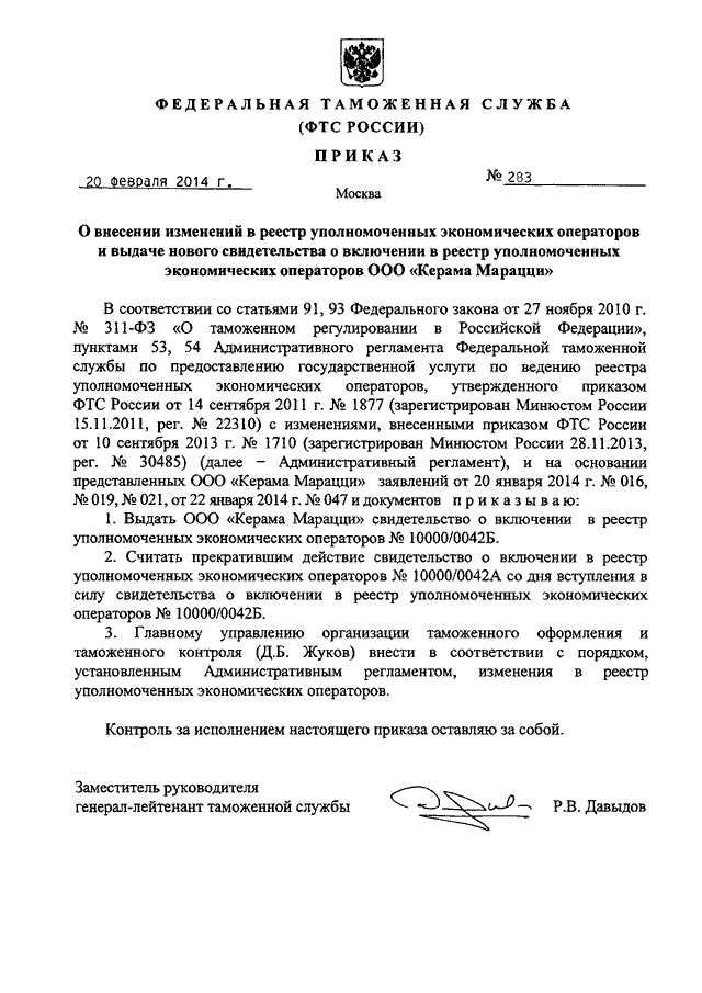ПРИКАЗ ФТС РФ от 20.02.2014 N 283