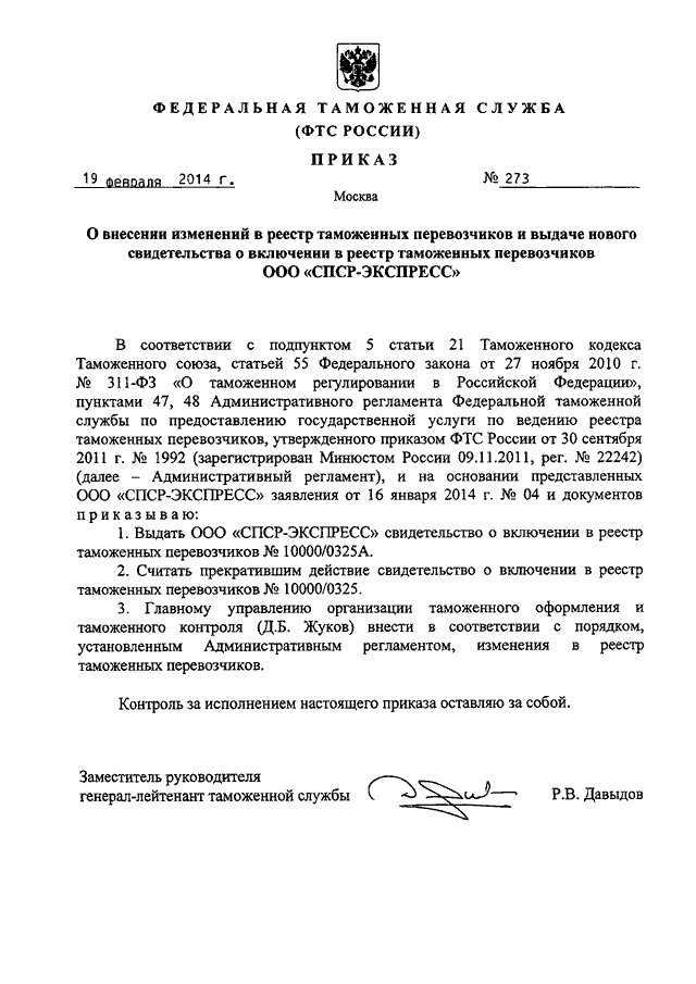ПРИКАЗ ФТС РФ от 19.02.2014 N 273