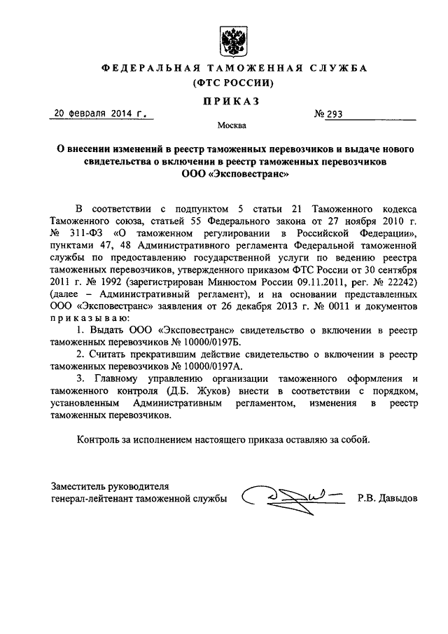 ПРИКАЗ ФТС РФ от 20.02.2014 N 293