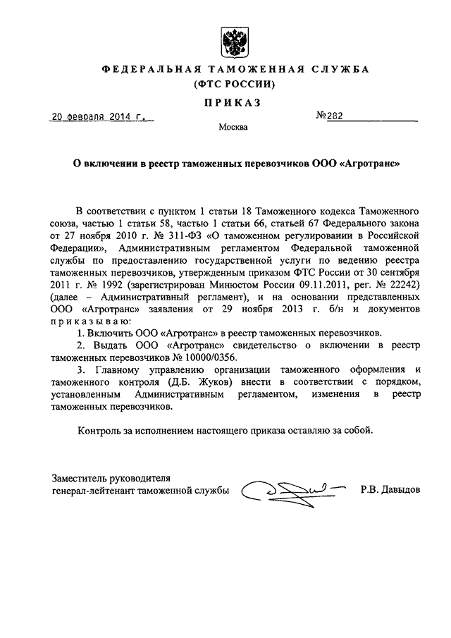 "О ВКЛЮЧЕНИИ В РЕЕСТР ТАМОЖЕННЫХ ПЕРЕВОЗЧИКОВ ООО "АГРОТРАНС"