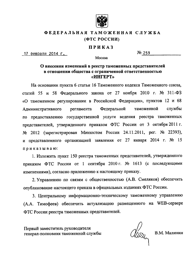 ПРИКАЗ ФТС РФ от 17.02.2014 N 259