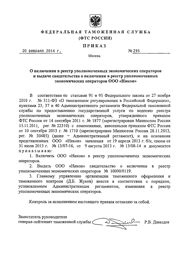"О ВКЛЮЧЕНИИ В РЕЕСТР УПОЛНОМОЧЕННЫХ ЭКОНОМИЧЕСКИХ ОПЕРАТОРОВ И ВЫДАЧЕ СВИДЕТЕЛЬСТВА О ВКЛЮЧЕНИИ В РЕЕСТР УПОЛНОМОЧЕННЫХ ЭКОНОМИЧЕСКИХ ОПЕРАТОРОВ ООО "НИКОН"
