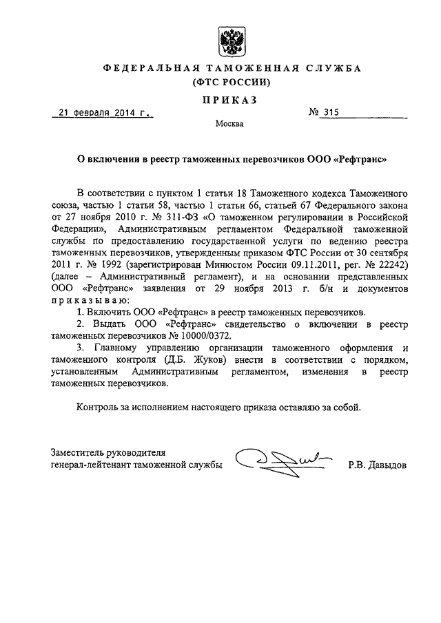 ПРИКАЗ ФТС РФ от 21.02.2014 N 315