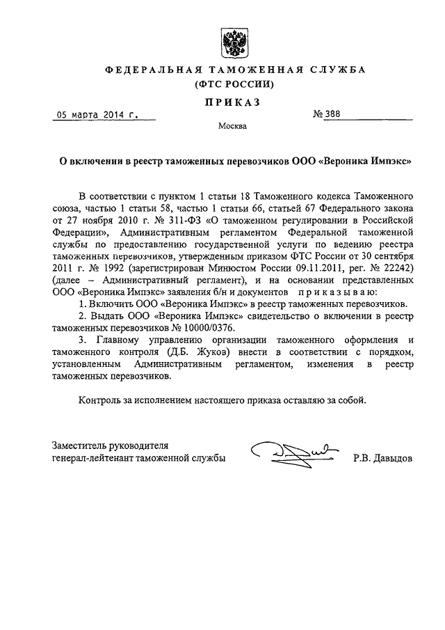 ПРИКАЗ ФТС РФ от 05.03.2014 N 388