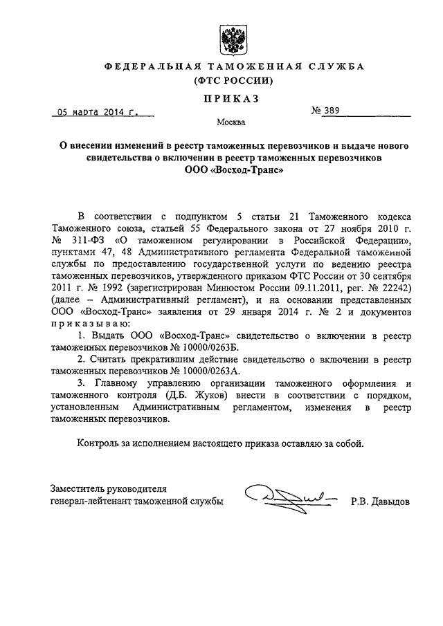 ПРИКАЗ ФТС РФ от 05.03.2014 N 389