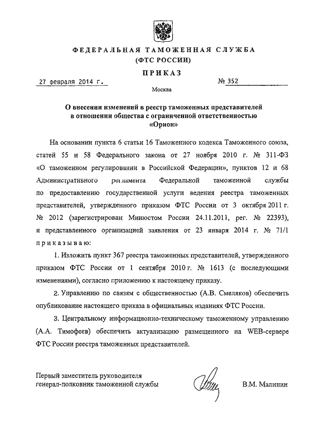 ПРИКАЗ ФТС РФ от 27.02.2014 N 352