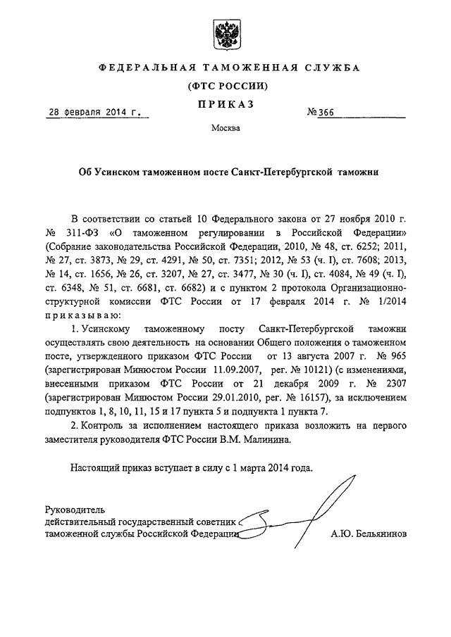 ПРИКАЗ ФТС РФ от 28.02.2014 N 366