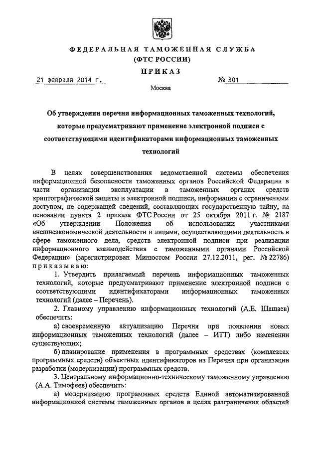 ПРИКАЗ ФТС РФ от 21.02.2014 N 301