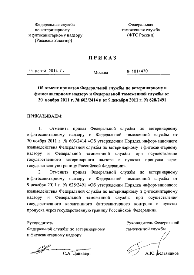 ПРИКАЗ Россельхознадзора N 101, ФТС РФ N 430 от 11.03.2014