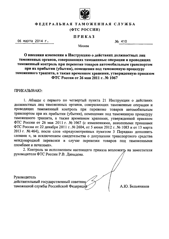 ПРИКАЗ ФТС РФ от 06.03.2014 N 410 "О ВНЕСЕНИИ ИЗМЕНЕНИЯ В ИНСТРУКЦИЮ О ДЕЙСТВИЯХ ДОЛЖНОСТНЫХ ЛИЦ