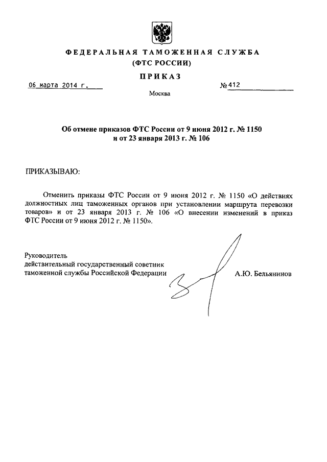 "ОБ ОТМЕНЕ ПРИКАЗОВ ФТС РОССИИ ОТ 9 ИЮНЯ 2012 Г. N 1150 И ОТ 23 ЯНВАРЯ 2013 Г. N 106"