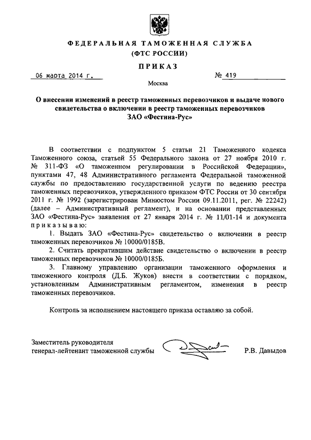 "О ВНЕСЕНИИ ИЗМЕНЕНИЙ В РЕЕСТР ТАМОЖЕННЫХ ПЕРЕВОЗЧИКОВ И ВЫДАЧЕ НОВОГО СВИДЕТЕЛЬСТВА О ВКЛЮЧЕНИИ В РЕЕСТР ТАМОЖЕННЫХ ПЕРЕВОЗЧИКОВ ЗАО "ФЕСТИНА-РУС"