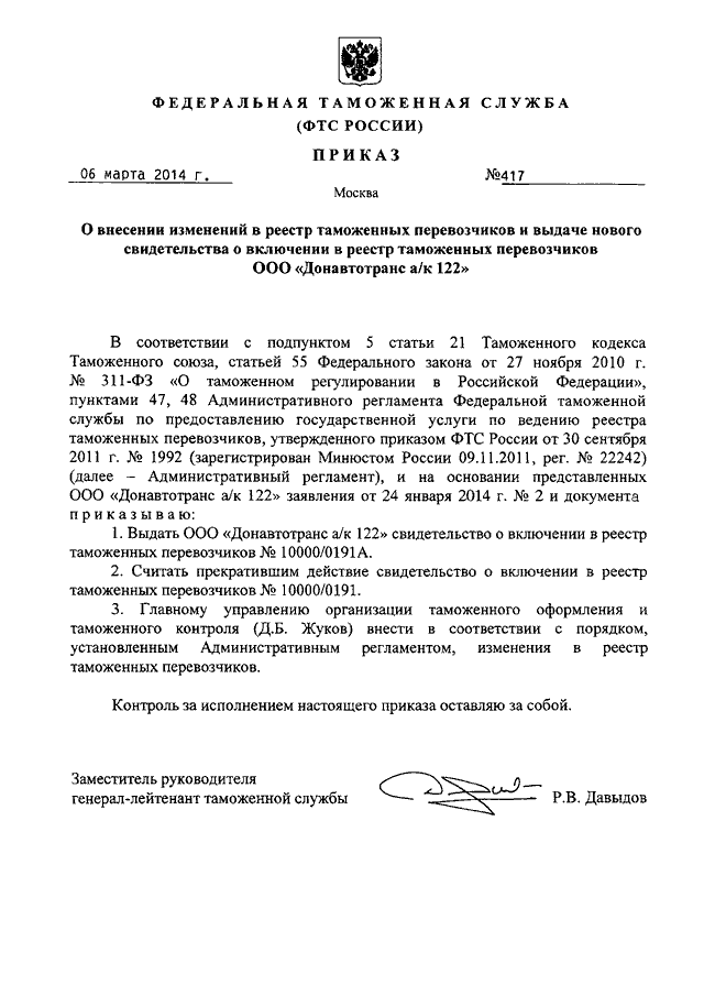 "О ВНЕСЕНИИ ИЗМЕНЕНИЙ В РЕЕСТР ТАМОЖЕННЫХ ПЕРЕВОЗЧИКОВ И ВЫДАЧЕ НОВОГО СВИДЕТЕЛЬСТВА О ВКЛЮЧЕНИИ В РЕЕСТР ТАМОЖЕННЫХ ПЕРЕВОЗЧИКОВ ООО "ДОНАВТОТРАНС А/К 122"