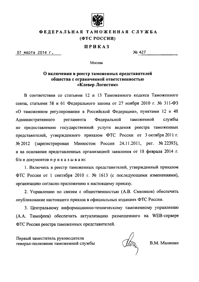 ПРИКАЗ ФТС РФ от 07.03.2014 N 427