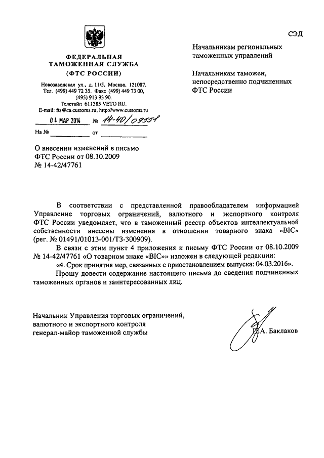 ПИСЬМО ФТС РФ от 04.03.2014 N 14-40/09551