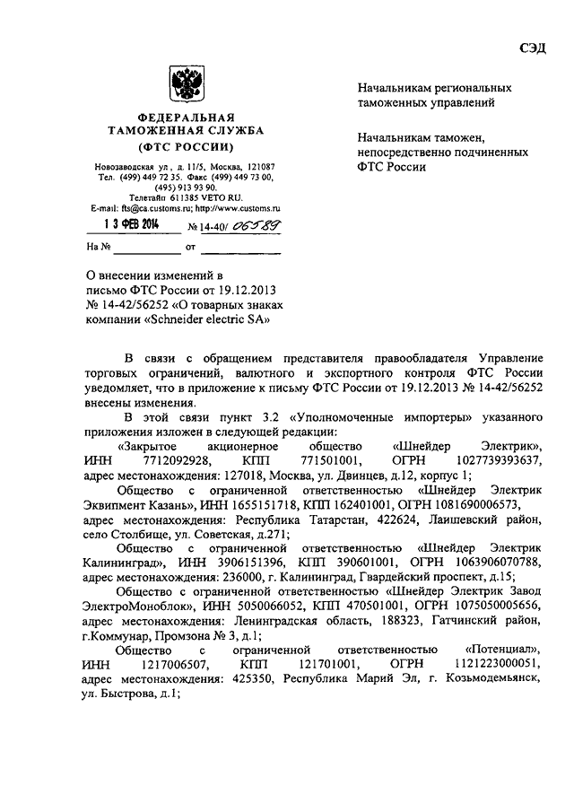 "О ВНЕСЕНИИ ИЗМЕНЕНИЙ В ПИСЬМО ФТС РОССИИ ОТ 19.12.2013 N 14-42/56252 "О ТОВАРНЫХ ЗНАКАХ КОМПАНИИ "SCHNEIDER ELECTRIC SA"