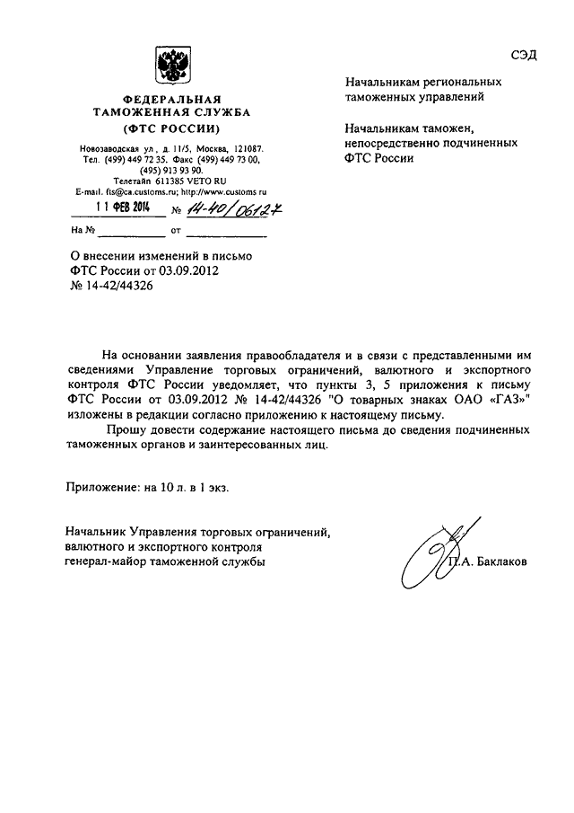 "О ВНЕСЕНИИ ИЗМЕНЕНИЙ В ПИСЬМО ФТС РОССИИ ОТ 03.09.2012 N 14-42/44326"