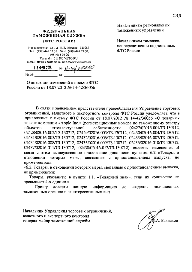 "О ВНЕСЕНИИ ИЗМЕНЕНИЙ В ПИСЬМО ФТС РОССИИ ОТ 18.07.2012 N 14-42/36056"