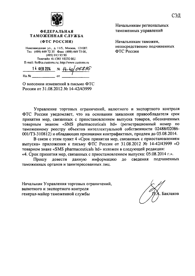 ПИСЬМО ФТС РФ от 14.02.2014 N 14-40/06836