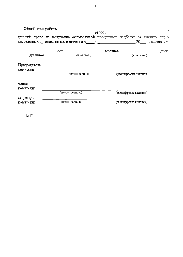 "ОБ УТВЕРЖДЕНИИ ИНСТРУКЦИИ ОБ ОРГАНИЗАЦИИ ВЫПЛАТЫ РАБОТНИКАМ ТАМОЖЕННЫХ ОРГАНОВ РОССИЙСКОЙ ФЕДЕРАЦИИ И УЧРЕЖДЕНИЙ, НАХОДЯЩИХСЯ В ВЕДЕНИИ ФТС РОССИИ, ЕЖЕМЕСЯЧНОЙ ПРОЦЕНТНОЙ НАДБАВКИ ЗА ВЫСЛУГУ ЛЕТ В ТАМОЖЕННЫХ ОРГАНАХ"