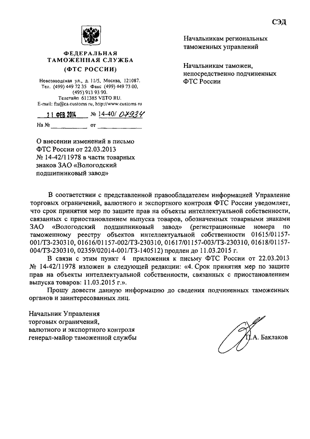 "О ВНЕСЕНИИ ИЗМЕНЕНИЙ В ПИСЬМО ФТС РОССИИ ОТ 22.03.2013 N 14-42/11978 В ЧАСТИ ТОВАРНЫХ ЗНАКОВ ЗАО "ВОЛОГОДСКИЙ ПОДШИПНИКОВЫЙ ЗАВОД"
