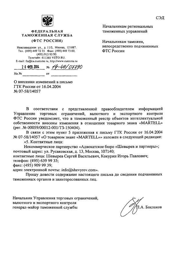 ПИСЬМО ФТС РФ от 20.02.2014 N 14-40/07790