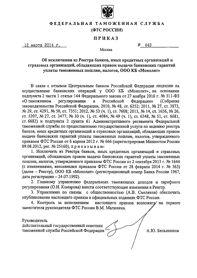 "ОБ ИСКЛЮЧЕНИИ ИЗ РЕЕСТРА БАНКОВ, ИНЫХ КРЕДИТНЫХ ОРГАНИЗАЦИЙ И СТРАХОВЫХ ОРГАНИЗАЦИЙ, ОБЛАДАЮЩИХ ПРАВОМ ВЫДАЧИ БАНКОВСКИХ ГАРАНТИЙ УПЛАТЫ ТАМОЖЕННЫХ ПОШЛИН, НАЛОГОВ, ООО КБ "МОНОЛИТ"