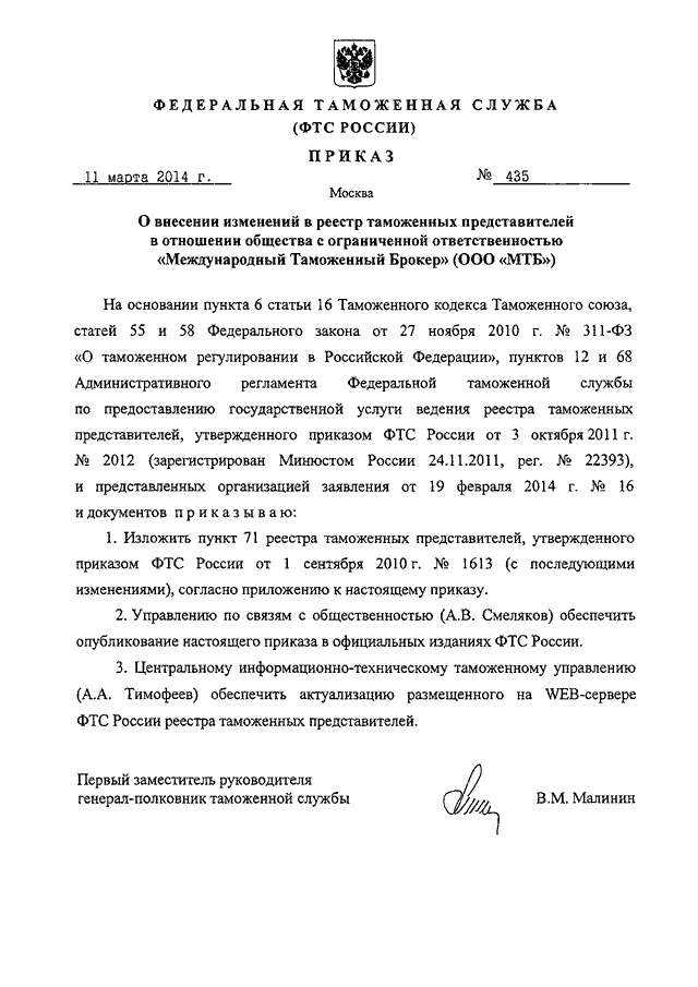 ПРИКАЗ ФТС РФ от 11.03.2014 N 435
