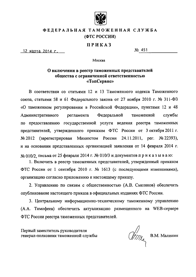 ПРИКАЗ ФТС РФ от 12.03.2014 N 451