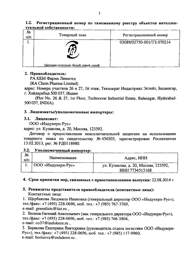 "О ТОВАРНОМ ЗНАКЕ КОМПАНИИ "РА КЕМ ФАРМА ЛИМИТЕД"