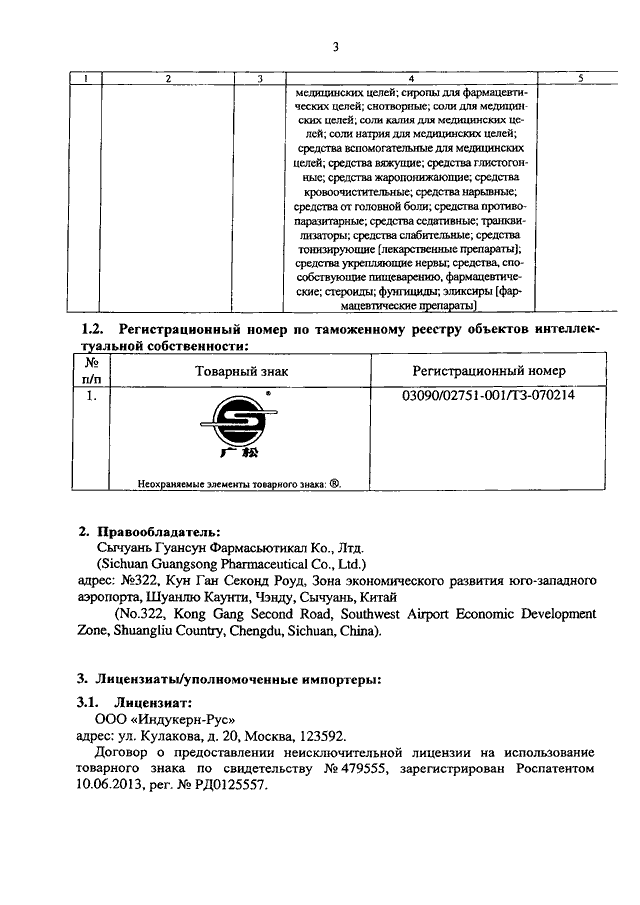 "О ТОВАРНОМ ЗНАКЕ КОМПАНИИ "СЫЧУАНЬ ГУАНСУН ФАРМАСЬЮТИКАЛ КО., ЛТД."
