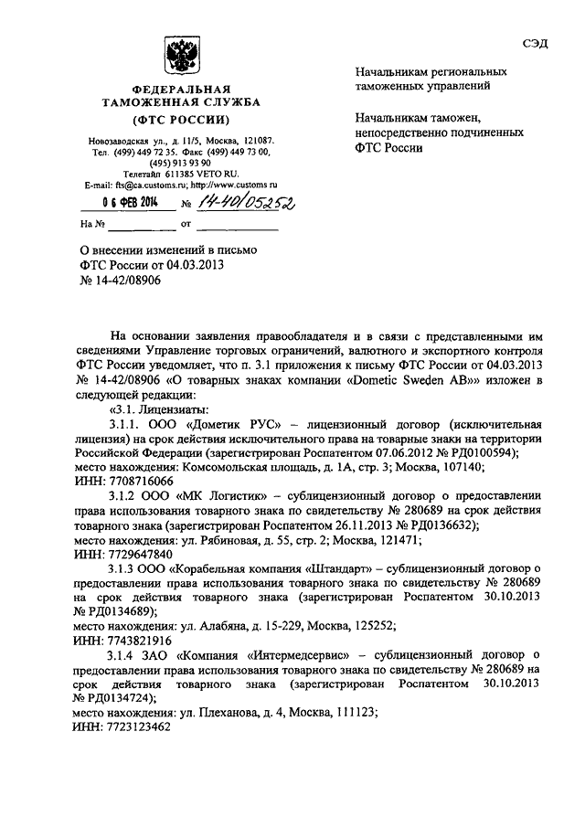 ПИСЬМО ФТС РФ от 06.02.2014 N 14-40/05252