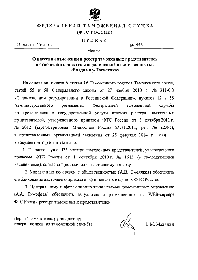 ПРИКАЗ ФТС РФ от 17.03.2014 N 468