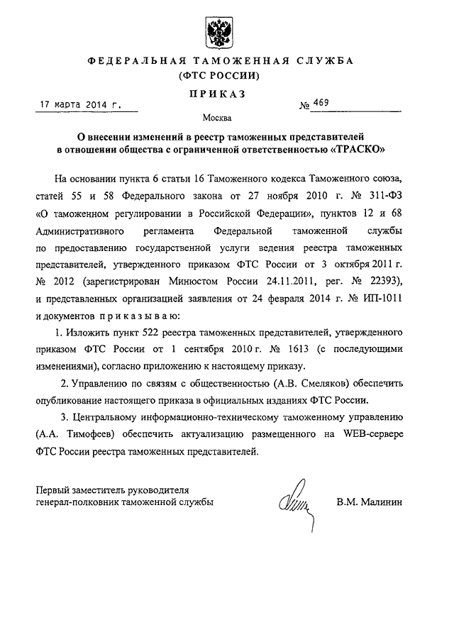 ПРИКАЗ ФТС РФ от 17.03.2014 N 469