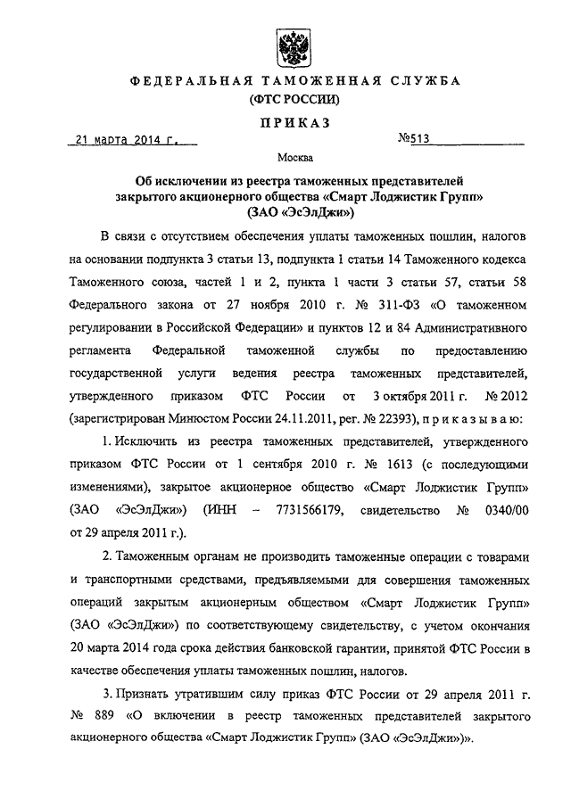 ПРИКАЗ ФТС РФ от 21.03.2014 N 513