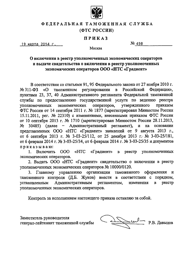 "О ВКЛЮЧЕНИИ В РЕЕСТР УПОЛНОМОЧЕННЫХ ЭКОНОМИЧЕСКИХ ОПЕРАТОРОВ И ВЫДАЧЕ СВИДЕТЕЛЬСТВА О ВКЛЮЧЕНИИ В РЕЕСТР УПОЛНОМОЧЕННЫХ ЭКОНОМИЧЕСКИХ ОПЕРАТОРОВ ООО "НТС "ГРАДИЕНТ"