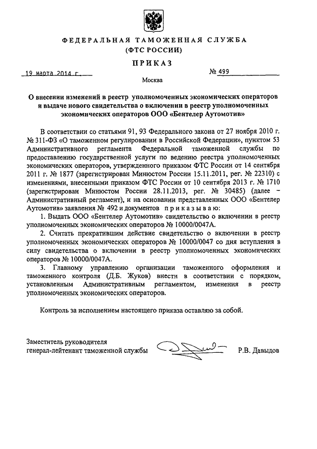 "О ВНЕСЕНИИ ИЗМЕНЕНИЙ В РЕЕСТР УПОЛНОМОЧЕННЫХ ЭКОНОМИЧЕСКИХ ОПЕРАТОРОВ И ВЫДАЧЕ НОВОГО СВИДЕТЕЛЬСТВА О ВКЛЮЧЕНИИ В РЕЕСТР УПОЛНОМОЧЕННЫХ ЭКОНОМИЧЕСКИХ ОПЕРАТОРОВ ООО "БЕНТЕЛЕР АУТОМОТИВ"