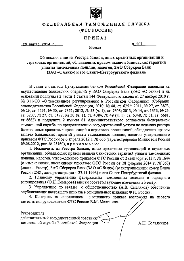 ПРИКАЗ ФТС РФ от 20.03.2014 N 507 "ОБ ИСКЛЮЧЕНИИ ИЗ РЕЕСТРА БАНКОВ, ИНЫХ КРЕДИТНЫХ ОРГАНИЗАЦИЙ И