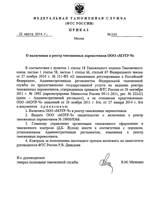 "О ВКЛЮЧЕНИИ В РЕЕСТР ТАМОЖЕННЫХ ПЕРЕВОЗЧИКОВ ООО "МЭТР-Ч"