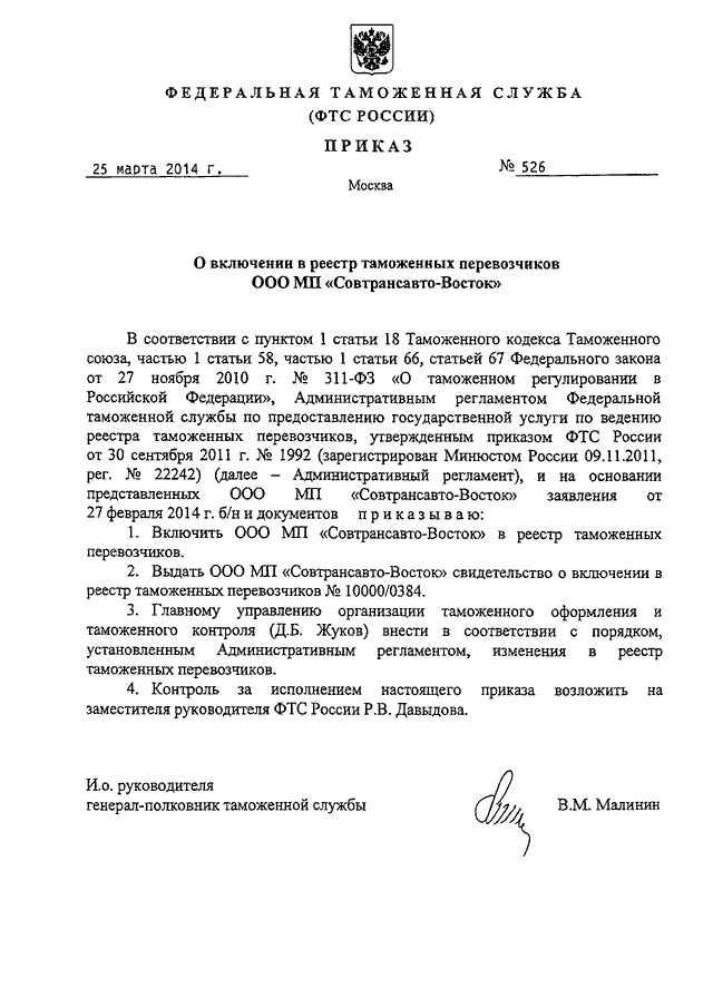 "О ВКЛЮЧЕНИИ В РЕЕСТР ТАМОЖЕННЫХ ПЕРЕВОЗЧИКОВ ООО МП "СОВТРАНСАВТО-ВОСТОК"