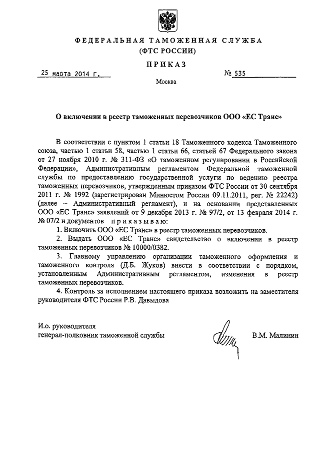 ПРИКАЗ ФТС РФ от 25.03.2014 N 535